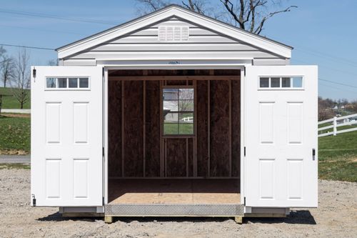 This simple, yet tasteful shed will add to your home’s outdoor appeal while offering you the storage space needed. The Lexington stands strong with its charcoal metal roof, siding accents, and sturdy double doors.